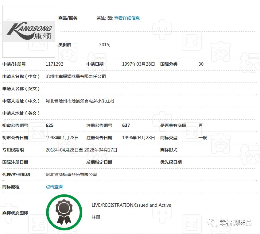 幸福調味品自創(chuàng)辦30多年以來,在工商部門指導下,充分認識到商標品牌的重要性,始終堅持走創(chuàng)品牌的路子。公司的“康頌”商標于1997年在30類,糖、茶、糕點、調味品類獲核準注冊后,并根據(jù)市場需要,先后又注冊了包括“滄獅”中文及拼音在內的等商標;形成了涵蓋多類別、多商品、多層次的商標品牌庫。